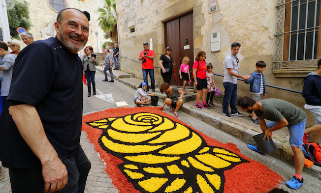 Resseguint el camí que al vespre va fer la Processó de Corpus per sobre les catifes, al capdamunt del Carrer Nou hi havia un mar de reivindicatives roses grogues que Quim Serrano va dissenyar enguany amb motiu de Sant Jordi, mentre que a la part baixa lluïa un mar de vaixells i peixos dissenyats per Joan Torner, que ha participat en la confecció d’estores per primera vegada.
