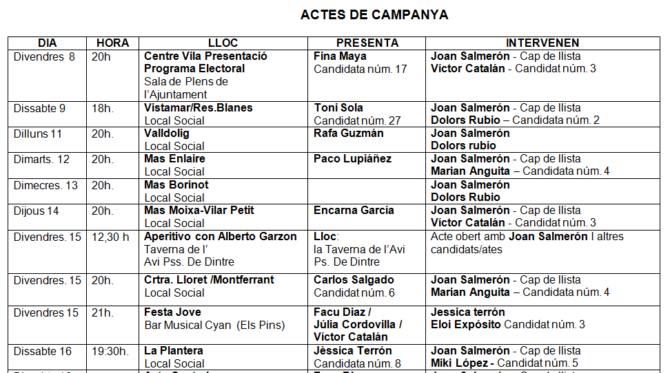 L’acte central de campanya es farà dissabte 16 de maig a la plaça Molina del barri de Quatre Vents, i comptarà amb l’actuació del quadre flamenc de’ Dani Candelas i el grup ‘Con Otros Aires’, a més d’una xocolatada infantil a la tarda. El divendres dia 15 les joventuts organitza’n la Festa Jove a la discoteca Cyan, que tindrà com a convidat especial i presentador al popular humorista blanenc Facu Díaz. La coalició tancarà la seva intensa campanya amb un acte a la plaça Montserrat Roig al barri de Ca L’Aguidó que inclourà una botifarrada popular per a tancar la campanya amb un bon regust.