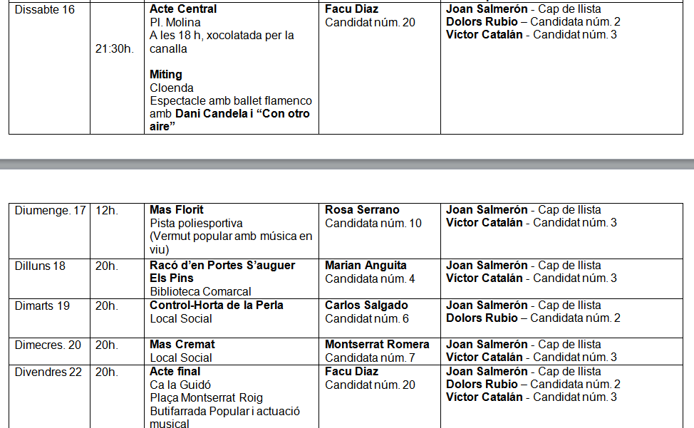 La formació d’esquerres ha planificat actes diàriament durant aquestes dues setmanes, a tots els barris del municipi, sempre amb la presència del seu candidat Joan Salmerón acompanyat d’altres membres de la candidatura, que canviaran en funció del barri i la temàtica principal.