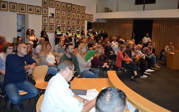 Quan va ser l’hora de començar el ple municipal, a les 7 de la tarda, la sala estava a vessar de públic de totes dues bandes que, abans que entressin els regidors i regidores, ja havien dipositat sobre la taula dels càrrecs electes cartells i enganxines de les dues postures contraposades. Quan l’alcalde va retirar alguns d’aquestes elements i des del públic es va reclamar que encara en quedaven visibles, va esclatar una picabaralla verbal entre els seguidors de les dues bandes.