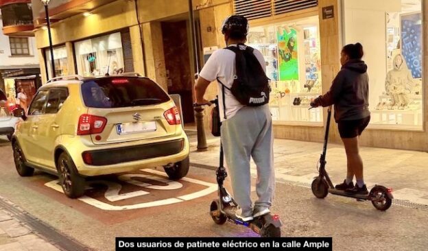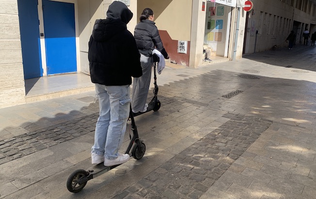 Dos personas circulan por la calle S’Auger contra dirección en patinete