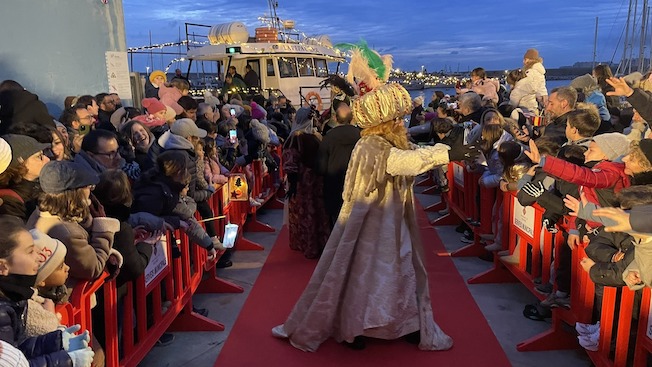 Melcior, Gaspar i Baltasar van arribar en un vaixell al port amb seu seguici més proper que els ha estat acompanyant en la llarga travessia des d’Orient. Una altra novetat ha estat l’arribada. El lloc on ha atracat el vaixell dels Reis d’Orient ha estat dins la zona del Port Pesquer, just al costat de la Confraria de Pescadors de Blanes.