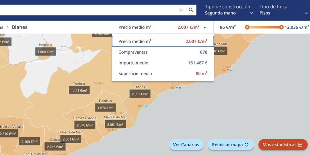 Los datos se pueden consultar por poblaciones. Se muestran datos de Blanes referidos al total de viviendas, pero también se ofrecen datos segmentados por vivienda mueva y de segunda mano, tanto de pisos como de casas.